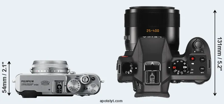 The side-by-side display below illustrates the physical size and weight of the Fujifilm X100 and the Leica V-LUX Typ 114. The two cameras are presented according to their relative size. Three consecutive views from the front, the top, and the rear side are shown. All width, height and depth dimensions are rounded to the nearest millimeter.