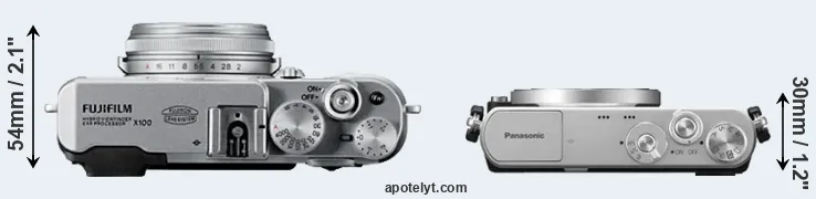 An illustration of the physical size and weight of the Fujifilm X100 and the Panasonic GM1 is provided in the side-by-side display below. The two cameras are presented according to their relative size. Three consecutive views from the front, the top, and the rear side are shown. All width, height and depth dimensions are rounded to the nearest millimeter.