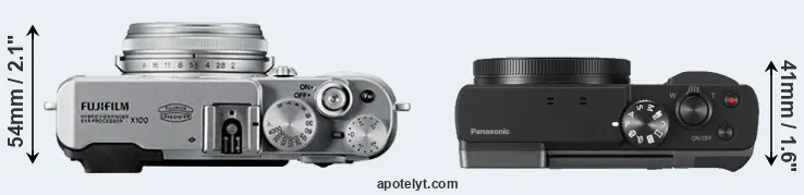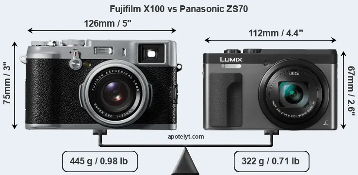 The physical size and weight of the Fujifilm X100 and the Panasonic ZS70 are illustrated in the side-by-side display below. The two cameras are presented according to their relative size. Three successive views from the front, the top, and the rear are shown. All width, height and depth measures are rounded to the nearest millimeter.