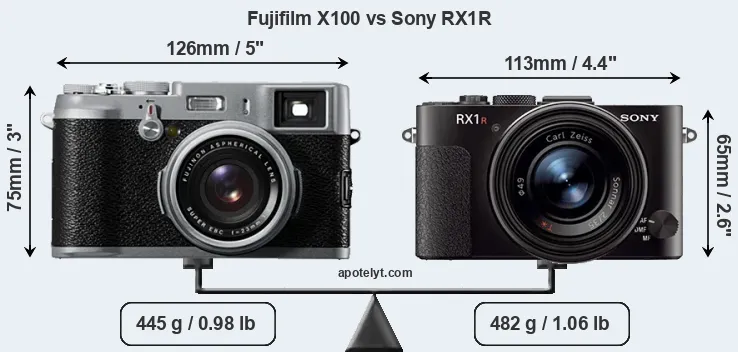 The physical size and weight of the Fujifilm X100 and the Sony RX1R are illustrated in the side-by-side display below. The two cameras are presented according to their relative size. Three consecutive perspectives from the front, the top, and the back are available. All width, height and depth measures are rounded to the nearest millimeter.