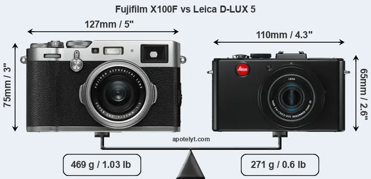 An illustration of the physical size and weight of the Fujifilm X100F and the Leica D-LUX 5 is provided in the side-by-side display below. The two cameras are presented according to their relative size. Three successive views from the front, the top, and the rear are shown. All width, height and depth dimensions are rounded to the nearest millimeter.