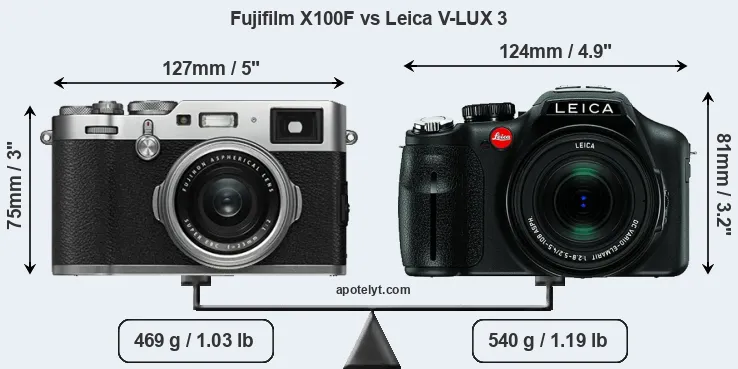 An illustration of the physical size and weight of the Fujifilm X100F and the Leica V-LUX 3 is provided in the side-by-side display below. The two cameras are presented according to their relative size. Three consecutive views from the front, the top, and the rear side are shown. All width, height and depth measures are rounded to the nearest millimeter.