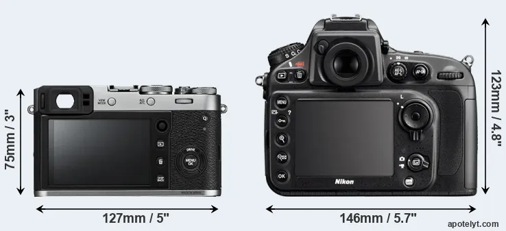 If the front view area (width x height) of the cameras is taken as an aggregate measure of their size, the Nikon D800 is considerably larger (89 percent) than the Fujifilm X100F. It is noteworthy in this context that the D800 is splash and dust-proof, while the X100F does not feature any corresponding weather-sealing.