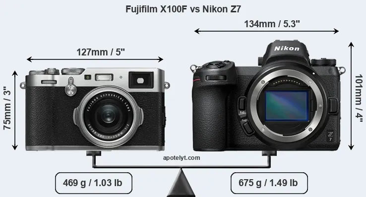 An illustration of the physical size and weight of the Fujifilm X100F and the Nikon Z7 is provided in the side-by-side display below. The two cameras are presented according to their relative size. Three successive views from the front, the top, and the rear are shown. All width, height and depth measures are rounded to the nearest millimeter.