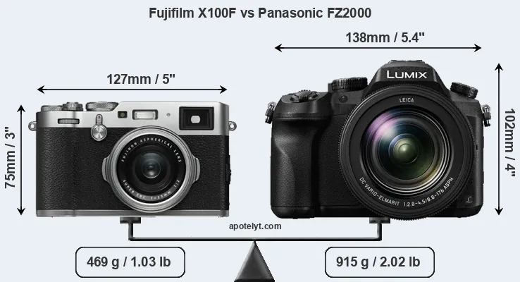 The side-by-side display below illustrates the physical size and weight of the Fujifilm X100F and the Panasonic FZ2000. The two cameras are presented according to their relative size. Three consecutive views from the front, the top, and the rear side are shown. All width, height and depth dimensions are rounded to the nearest millimeter.