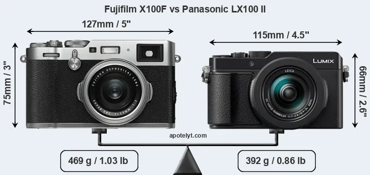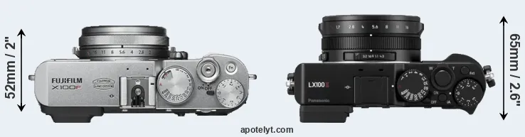 The side-by-side display below illustrates the physical size and weight of the Fujifilm X100F and the Panasonic LX100 II. The two cameras are presented according to their relative size. Three consecutive perspectives from the front, the top, and the back are available. All width, height and depth dimensions are rounded to the nearest millimeter.
