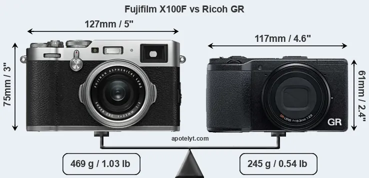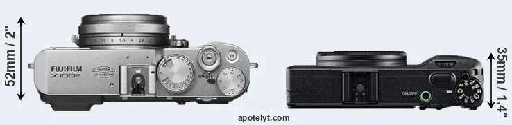 The side-by-side display below illustrates the physical size and weight of the Fujifilm X100F and the Ricoh GR. The two cameras are presented according to their relative size. Three consecutive perspectives from the front, the top, and the back are available. All width, height and depth measures are rounded to the nearest millimeter.