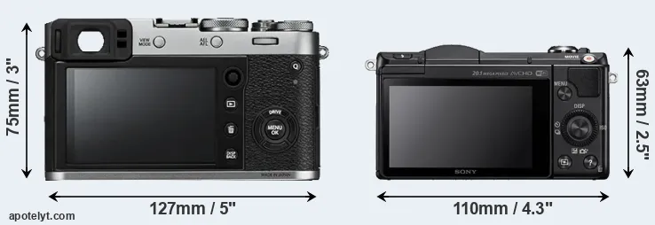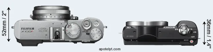 The side-by-side display below illustrates the physical size and weight of the Fujifilm X100F and the Sony A5000. The two cameras are presented according to their relative size. Three consecutive perspectives from the front, the top, and the back are available. All width, height and depth measures are rounded to the nearest millimeter.