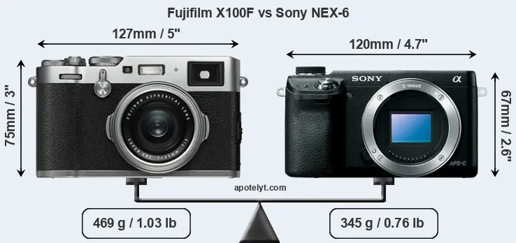 The side-by-side display below illustrates the physical size and weight of the Fujifilm X100F and the Sony NEX-6. The two cameras are presented according to their relative size. Three successive views from the front, the top, and the rear are shown. All width, height and depth measures are rounded to the nearest millimeter.