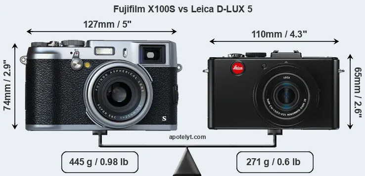 An illustration of the physical size and weight of the Fujifilm X100S and the Leica D-LUX 5 is provided in the side-by-side display below. The two cameras are presented according to their relative size. Three consecutive perspectives from the front, the top, and the back are available. All width, height and depth dimensions are rounded to the nearest millimeter.