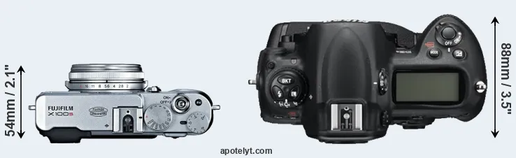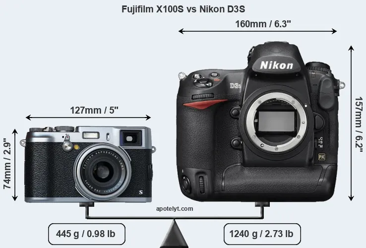 If the front view area (width x height) of the cameras is taken as an aggregate measure of their size, the Nikon D3S is considerably larger (167 percent) than the Fujifilm X100S. It is noteworthy in this context that the D3S is splash and dust-proof, while the X100S does not feature any corresponding weather-sealing.
