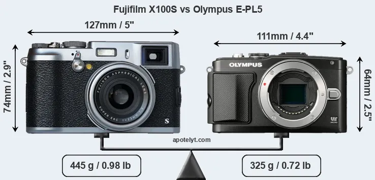 The physical size and weight of the Fujifilm X100S and the Olympus E-PL5 are illustrated in the side-by-side display below. The two cameras are presented according to their relative size. Three consecutive perspectives from the front, the top, and the back are available. All width, height and depth measures are rounded to the nearest millimeter.