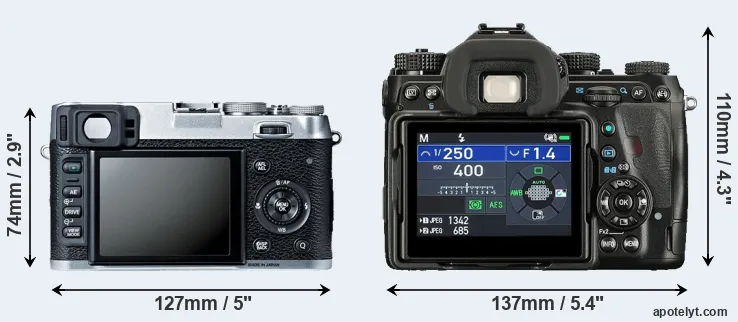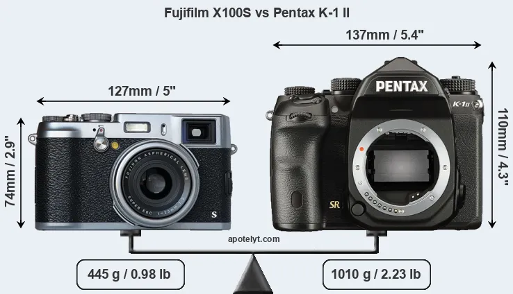 If the front view area (width x height) of the cameras is taken as an aggregate measure of their size, the Pentax K-1 II is considerably larger (60 percent) than the Fujifilm X100S. It is noteworthy in this context that the K-1 II is splash and dust-proof, while the X100S does not feature any corresponding weather-sealing.