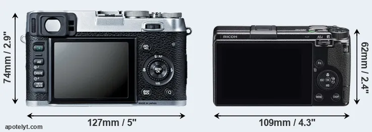 The side-by-side display below illustrates the physical size and weight of the Fujifilm X100S and the Ricoh GR IIIx. The two cameras are presented according to their relative size. Three consecutive perspectives from the front, the top, and the back are available. All width, height and depth measures are rounded to the nearest millimeter.