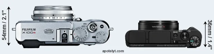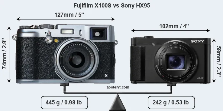 The physical size and weight of the Fujifilm X100S and the Sony HX95 are illustrated in the side-by-side display below. The two cameras are presented according to their relative size. Three consecutive perspectives from the front, the top, and the back are available. All size dimensions are rounded to the nearest millimeter.