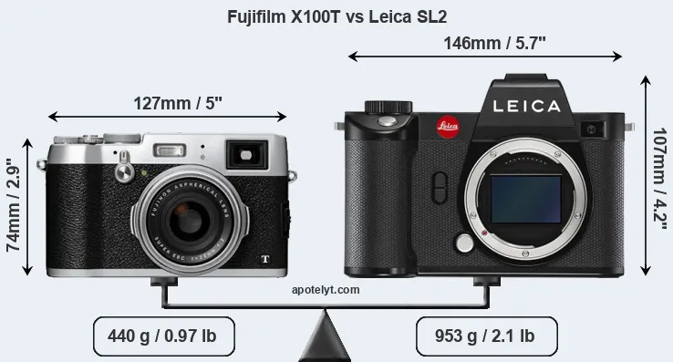 The physical size and weight of the Fujifilm X100T and the Leica SL2 are illustrated in the side-by-side display below. The two cameras are presented according to their relative size. Three consecutive perspectives from the front, the top, and the back are available. All width, height and depth dimensions are rounded to the nearest millimeter.