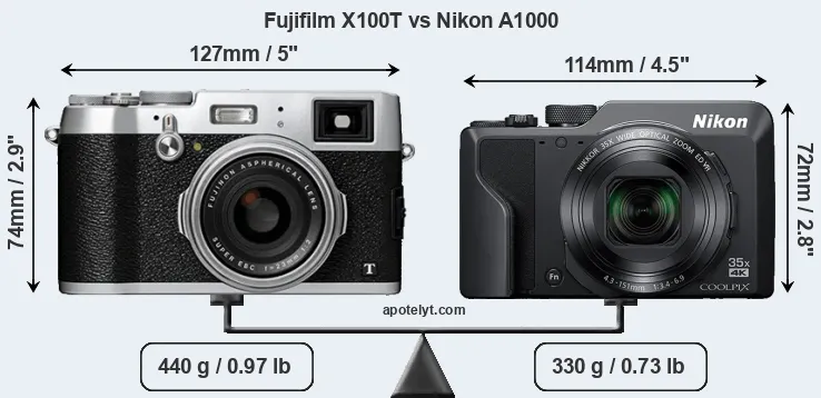 The Fujifilm X100T and the Nikon Coolpix A1000 are two digital cameras that were officially introduced, respectively, in September 2014 and January 2019. Both the X100T and the A1000 are fixed lens compact cameras that are based on an APS-C (X100T) and a 1/2.3-inch (A1000) sensor. The Fujifilm has a resolution of 16 megapixels, whereas the Nikon provides 15.9 MP.