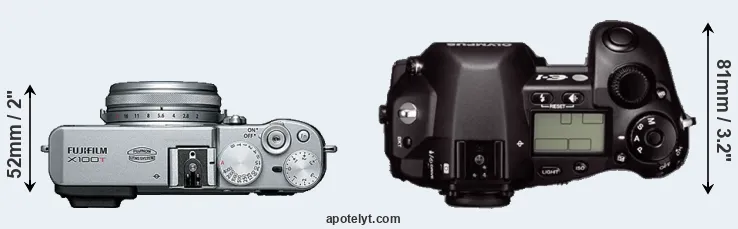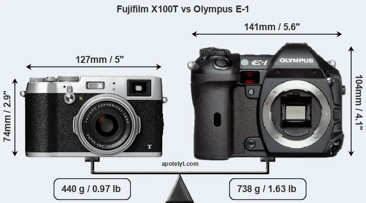 If the front view area (width x height) of the cameras is taken as an aggregate measure of their size, the Olympus E-1 is considerably larger (56 percent) than the Fujifilm X100T. It is noteworthy in this context that the E-1 is splash and dust-proof, while the X100T does not feature any corresponding weather-sealing.