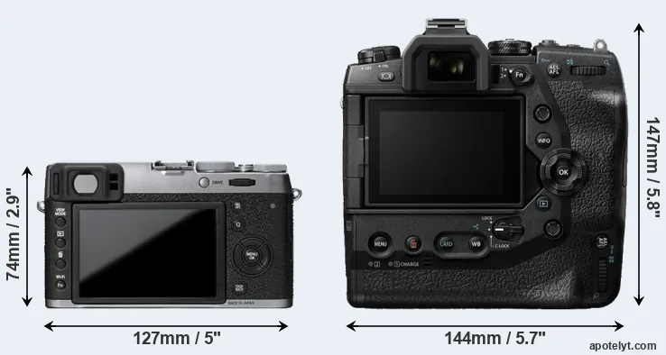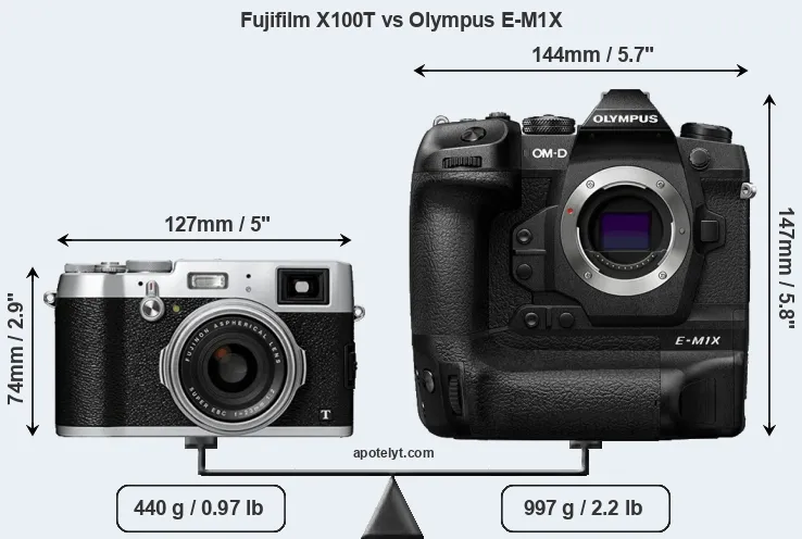 If the front view area (width x height) of the cameras is taken as an aggregate measure of their size, the Olympus E-M1X is considerably larger (125 percent) than the Fujifilm X100T. It is noteworthy in this context that the E-M1X is splash and dust-proof, while the X100T does not feature any corresponding weather-sealing.