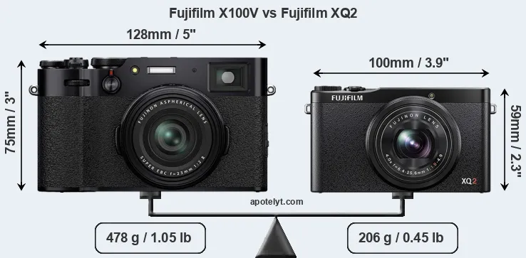 If the front view area (width x height) of the cameras is taken as an aggregate measure of their size, the Fujifilm XQ2 is considerably smaller (39 percent) than the Fujifilm X100V. Moreover, the XQ2 is substantially lighter (57 percent) than the X100V. It is worth mentioning in this context that the X100V is splash and dust resistant, while the XQ2 does not feature any corresponding weather-sealing.