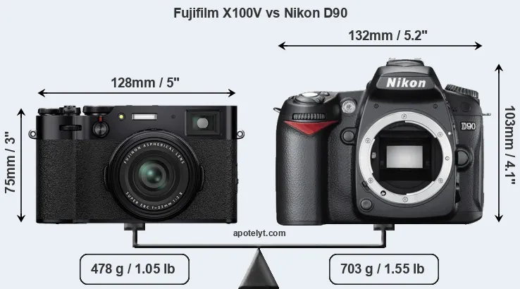 The above size and weight comparisons are to some extent incomplete and possibly misleading, as the X100V has a lens built in, whereas the D90 is an interchangeable lens camera that requires a separate lens. Attaching the latter will add extra weight and bulk to the setup. You can compare the optics available for the D90 and their specifications in the Nikon Lens Catalog.