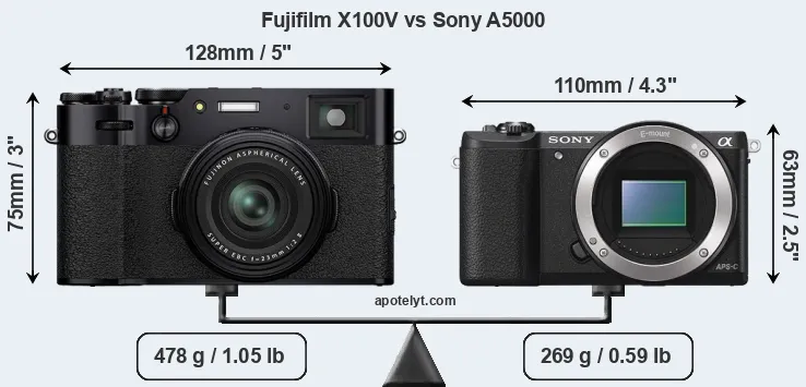 An illustration of the physical size and weight of the Fujifilm X100V and the Sony A5000 is provided in the side-by-side display below. The two cameras are presented according to their relative size. Three consecutive perspectives from the front, the top, and the back are available. All width, height and depth dimensions are rounded to the nearest millimeter.