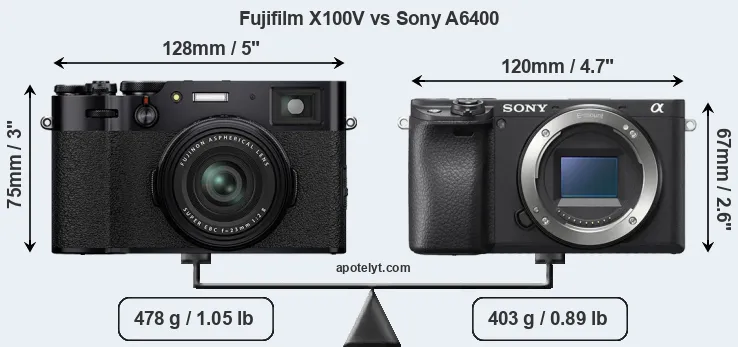 The side-by-side display below illustrates the physical size and weight of the Fujifilm X100V and the Sony A6400. The two cameras are presented according to their relative size. Three consecutive perspectives from the front, the top, and the back are available. All width, height and depth dimensions are rounded to the nearest millimeter.