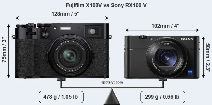 An illustration of the physical size and weight of the Fujifilm X100V and the Sony RX100 V is provided in the side-by-side display below. The two cameras are presented according to their relative size. Three consecutive perspectives from the front, the top, and the back are available. All size dimensions are rounded to the nearest millimeter.