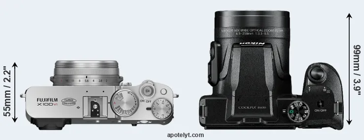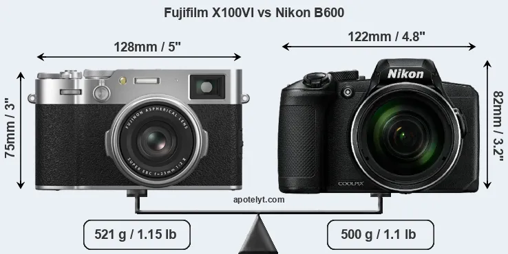 An illustration of the physical size and weight of the Fujifilm X100VI and the Nikon B600 is provided in the side-by-side display below. The two cameras are presented according to their relative size. Three consecutive views from the front, the top, and the rear side are shown. All width, height and depth measures are rounded to the nearest millimeter.