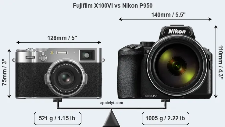 An illustration of the physical size and weight of the Fujifilm X100VI and the Nikon P950 is provided in the side-by-side display below. The two cameras are presented according to their relative size. Three consecutive views from the front, the top, and the rear side are shown. All size dimensions are rounded to the nearest millimeter.