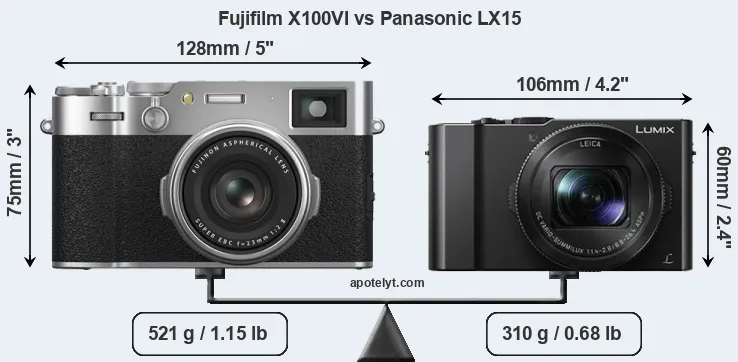 An illustration of the physical size and weight of the Fujifilm X100VI and the Panasonic LX15 is provided in the side-by-side display below. The two cameras are presented according to their relative size. Three consecutive perspectives from the front, the top, and the back are available. All size dimensions are rounded to the nearest millimeter.