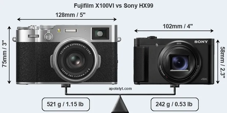 An illustration of the physical size and weight of the Fujifilm X100VI and the Sony HX99 is provided in the side-by-side display below. The two cameras are presented according to their relative size. Three consecutive views from the front, the top, and the rear side are shown. All width, height and depth measures are rounded to the nearest millimeter.