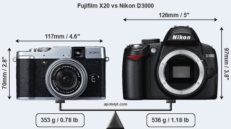 An illustration of the physical size and weight of the Fujifilm X20 and the Nikon D3000 is provided in the side-by-side display below. The two cameras are presented according to their relative size. Three consecutive perspectives from the front, the top, and the back are available. All width, height and depth measures are rounded to the nearest millimeter.