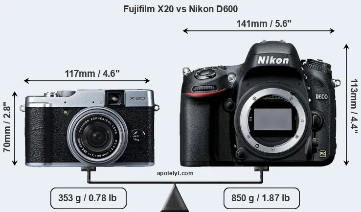 An illustration of the physical size and weight of the Fujifilm X20 and the Nikon D600 is provided in the side-by-side display below. The two cameras are presented according to their relative size. Three successive views from the front, the top, and the rear are shown. All size dimensions are rounded to the nearest millimeter.