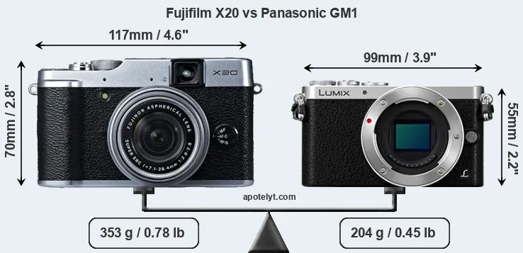 An illustration of the physical size and weight of the Fujifilm X20 and the Panasonic GM1 is provided in the side-by-side display below. The two cameras are presented according to their relative size. Three successive views from the front, the top, and the rear are shown. All size dimensions are rounded to the nearest millimeter.