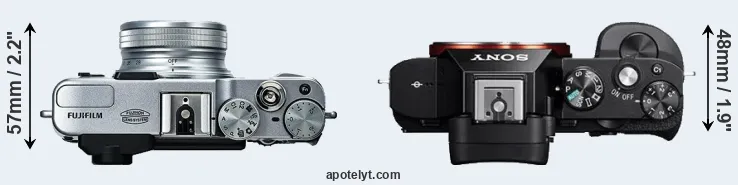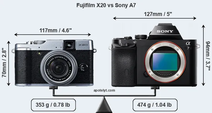 If the front view area (width x height) of the cameras is taken as an aggregate measure of their size, the Sony A7 is considerably larger (46 percent) than the Fujifilm X20. It is noteworthy in this context that the A7 is splash and dust-proof, while the X20 does not feature any corresponding weather-sealing.