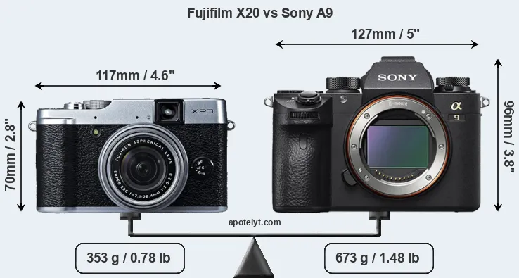 The side-by-side display below illustrates the physical size and weight of the Fujifilm X20 and the Sony A9. The two cameras are presented according to their relative size. Three consecutive perspectives from the front, the top, and the back are available. All size dimensions are rounded to the nearest millimeter.