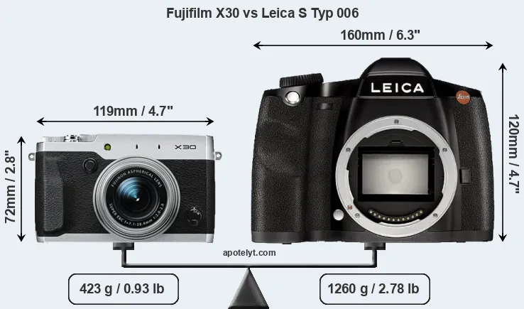 The side-by-side display below illustrates the physical size and weight of the Fujifilm X30 and the Leica S Typ 006. The two cameras are presented according to their relative size. Three successive views from the front, the top, and the rear are shown. All width, height and depth measures are rounded to the nearest millimeter.