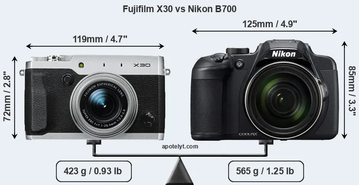 If the front view area (width x height) of the cameras is taken as an aggregate measure of their size, the Nikon B700 is notably larger (24 percent) than the Fujifilm X30. Moreover, the B700 is markedly heavier (34 percent) than the X30. In this context, it is worth noting that neither the X30 nor the B700 are weather-sealed.