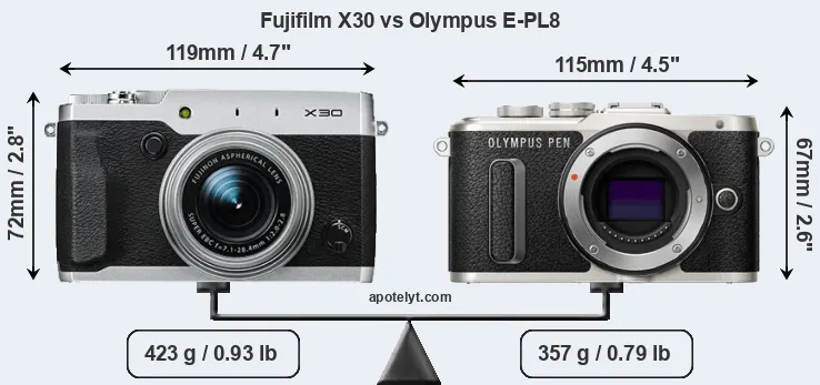An illustration of the physical size and weight of the Fujifilm X30 and the Olympus E-PL8 is provided in the side-by-side display below. The two cameras are presented according to their relative size. Three successive views from the front, the top, and the rear are shown. All size dimensions are rounded to the nearest millimeter.