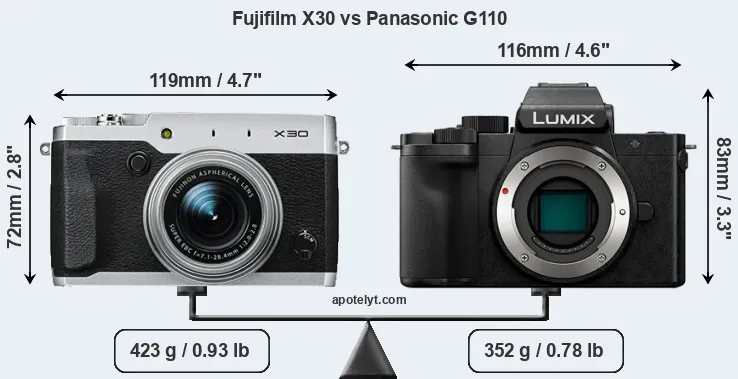 If the front view area (width x height) of the cameras is taken as an aggregate measure of their size, the Panasonic G110 is notably larger (12 percent) than the Fujifilm X30. In this context, it is worth noting that neither the X30 nor the G110 are weather-sealed.