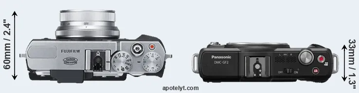 The physical size and weight of the Fujifilm X30 and the Panasonic GF2 are illustrated in the side-by-side display below. The two cameras are presented according to their relative size. Three consecutive views from the front, the top, and the rear side are shown. All size dimensions are rounded to the nearest millimeter.