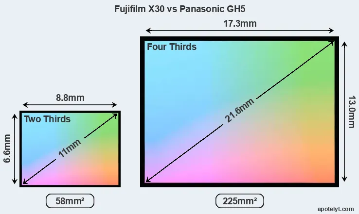 Of the two cameras under consideration, the Fujifilm X30 features a 2/3 sensor and the Panasonic GH5 a Four Thirds sensor. The sensor area in the GH5 is 288 percent bigger. As a result of these sensor size differences, the cameras have a format factor of, respectively, 3.9 and 2.0. Both cameras feature a native aspect ratio (sensor width to sensor height) of 4:3.