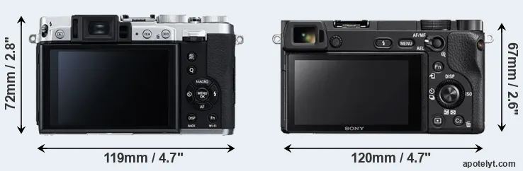 The physical size and weight of the Fujifilm X30 and the Sony A6300 are illustrated in the side-by-side display below. The two cameras are presented according to their relative size. Three consecutive perspectives from the front, the top, and the back are available. All width, height and depth measures are rounded to the nearest millimeter.