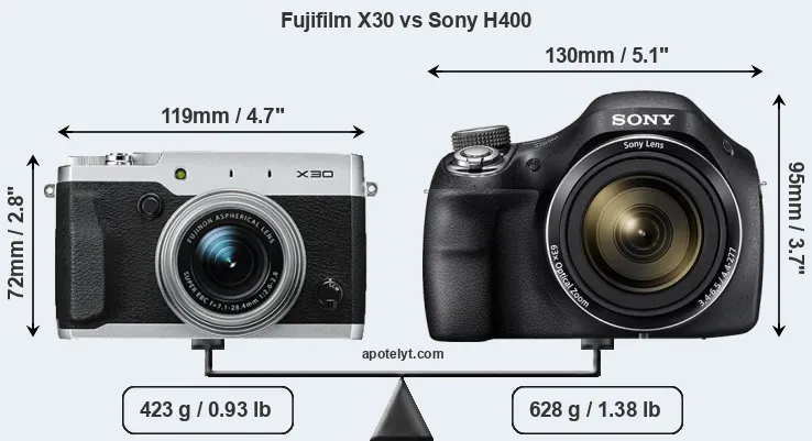 An illustration of the physical size and weight of the Fujifilm X30 and the Sony H400 is provided in the side-by-side display below. The two cameras are presented according to their relative size. Three successive views from the front, the top, and the rear are shown. All width, height and depth dimensions are rounded to the nearest millimeter.