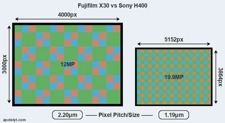 Despite having a smaller sensor, the H400 offers a higher resolution of 19.9 megapixels, compared with 12 MP of the X30. This megapixels advantage comes at the cost of a higher pixel density and a smaller size of the individual pixel (with a pixel pitch of 1.19μm versus 2.20μm for the X30). Moreover, it should be noted that the X30 is a somewhat more recent model (by 6 months) than the H400, and its sensor might have benefitted from technological advances during this time that further enhance the light gathering capacity of its pixels. Coming back to sensor resolution, it should be mentioned that neither of the two cameras has an anti-alias filter installed, so they are able to capture all the detail the sensor resolves.