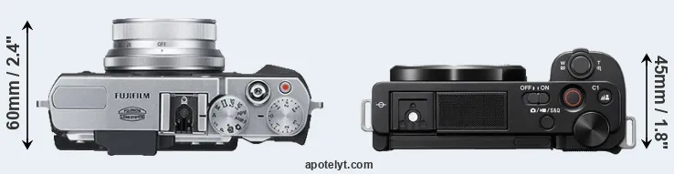 The side-by-side display below illustrates the physical size and weight of the Fujifilm X30 and the Sony ZV-E10. The two cameras are presented according to their relative size. Three consecutive views from the front, the top, and the rear side are shown. All width, height and depth dimensions are rounded to the nearest millimeter.