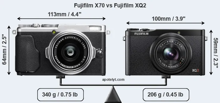 If the front view area (width x height) of the cameras is taken as an aggregate measure of their size, the Fujifilm XQ2 is notably smaller (18 percent) than the Fujifilm X70. Moreover, the XQ2 is substantially lighter (39 percent) than the X70. In this context, it is worth noting that neither the X70 nor the XQ2 are weather-sealed.