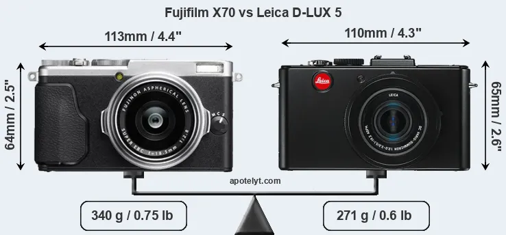 If the front view area (width x height) of the cameras is taken as an aggregate measure of their size, the Leica D-LUX 5 is somewhat smaller (1 percent) than the Fujifilm X70. Moreover, the D-LUX 5 is markedly lighter (20 percent) than the X70. In this context, it is worth noting that neither the X70 nor the D-LUX 5 are weather-sealed.