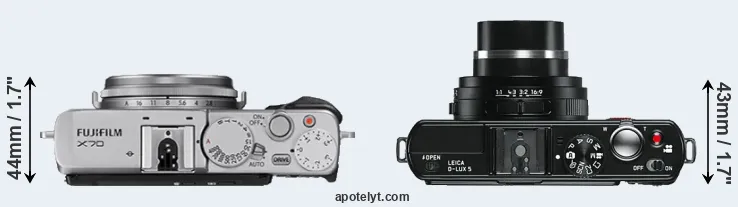 The Fujifilm X70 and the Leica D-LUX 5 are two digital cameras that were announced, respectively, in January 2016 and September 2010. Both the X70 and the D-LUX 5 are fixed lens compact cameras that are based on an APS-C (X70) and a 1/1.7-inch (D-LUX 5) sensor. The Fujifilm has a resolution of 16 megapixels, whereas the Leica provides 10 MP.
